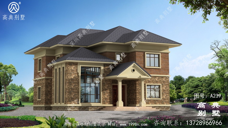 这一款具有乡村风情的欧式二层别墅,造型设计简洁,选用当代原素装饰设计墙体,提高房间内的光照,并且做到墙体的装饰设计功效。