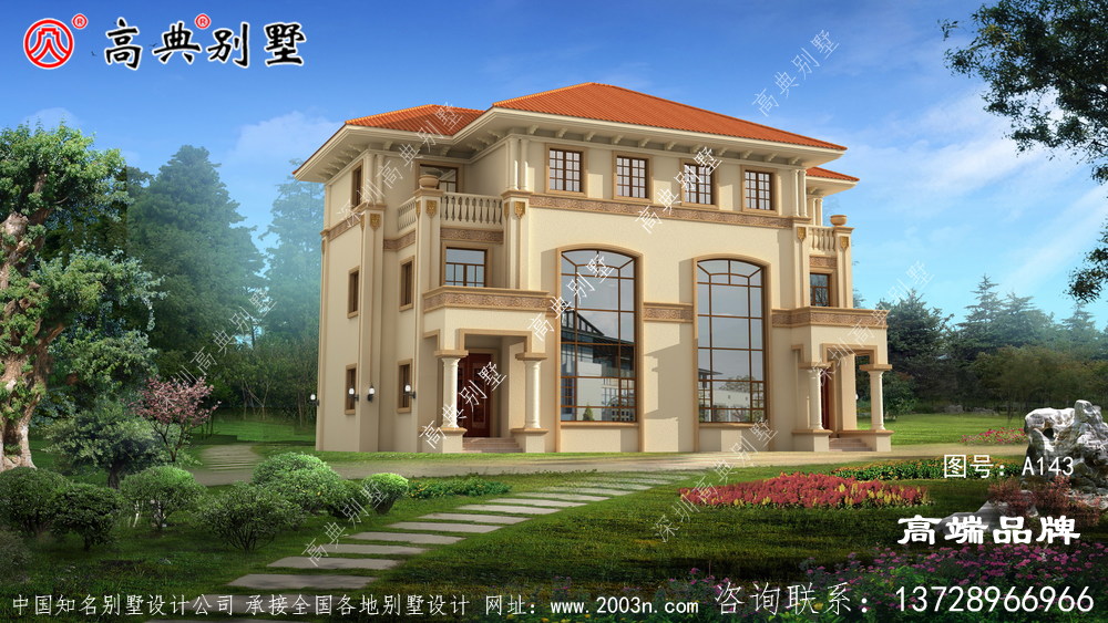 三层别墅建筑,坡顶,二层带阳台,屋顶带露台,是居住者呼吸新鲜空气、晾晒衣物、摆放盆栽的好地方,具有实用性和观赏性。